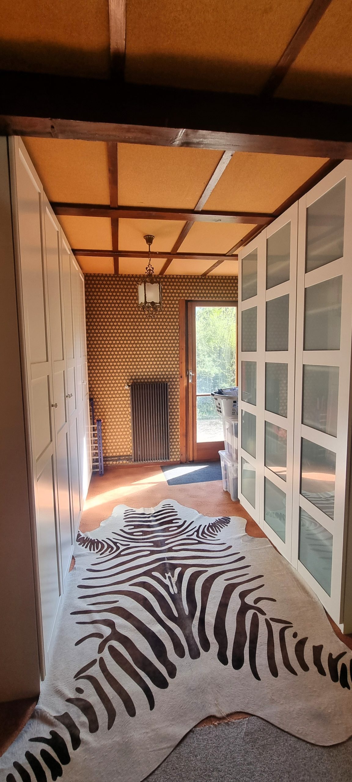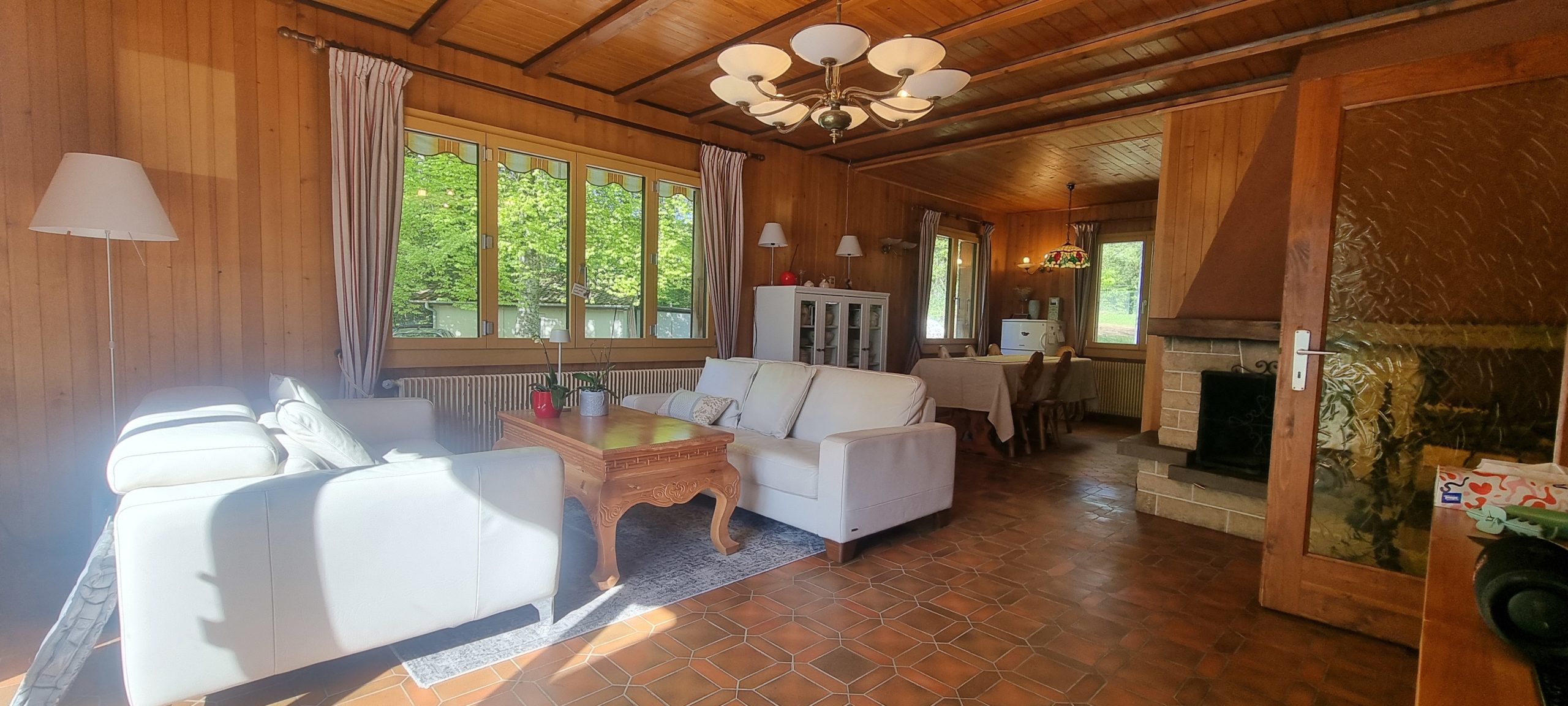 Le séjour s’ouvre sur l’extérieur grâce à une baie vitrée, laissant entrer la lumière et offrant une belle vue sur la végétation environnante. L’atmosphère y est chaleureuse, tournée vers la nature.
